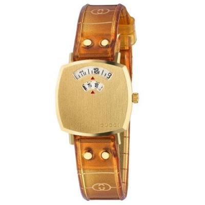 【包稅】預訂款1個月GUCCI/古馳女士石英機芯黃金PVD錶殼與透明的焦糖色再生橡膠錶帶GG印花Grip手錶27毫米663933I86108573