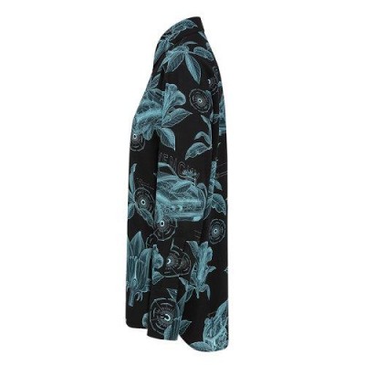 黑色双绉长袖衬衫,饰有蓝色花卉Schematics印花。隐藏式扣袢,弧形下摆,后片较长。
