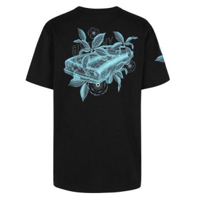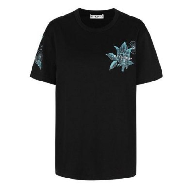 黑色针织T恤,胸前饰有白色GIVENCHY PARIS标志,胸面、背面和右袖饰有蓝色花卉Schematics印花。