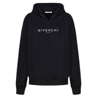 黑色Felpa超大号连帽运动衫,胸部饰有白色复古效果GIVENCHY PARIS签名。两侧有两个口袋。