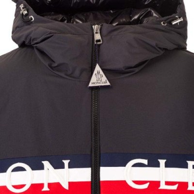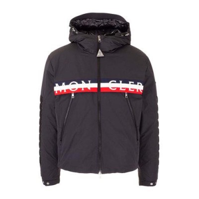 Moncler/蒙克萊男士服裝黑色連帽字母LOGO藍白紅條紋拉鍊口袋短款羽絨服男士羽絨服