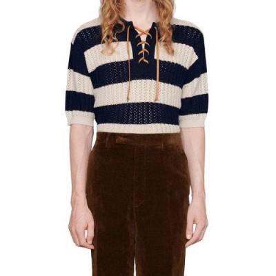 【包稅】GUCCI/古馳21年早春新款男士深藍色和灰白色條紋羊毛混紡系帶polo衫642777XKBQM4650