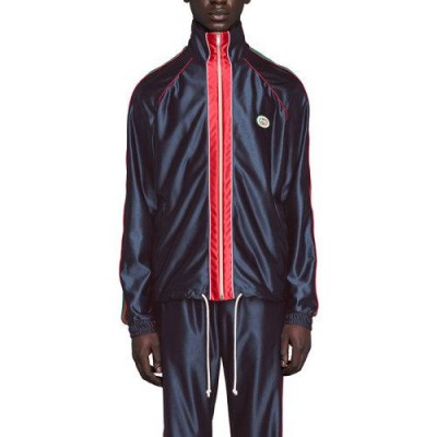 在整个Opening系列中,邀请了违反规范的闪亮面料。这款运动服式夹克采用柔软闪亮的技术涤纶平纹针织面料制成。迷人的深蓝色织物像帆布一样,展示了标志性的细节,例如马术风格的织带和GG细节轭。