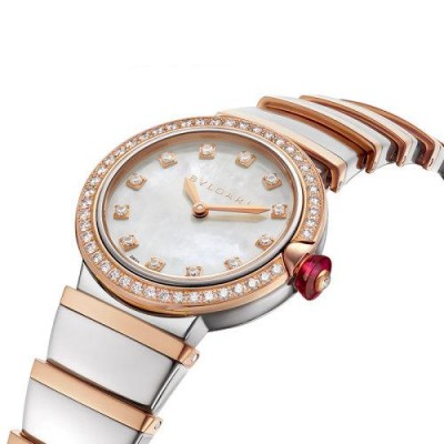 【包税】预定2-3周 BVLGARI/宝格丽 18k金t玫瑰金表圈 镶有明亮式切割钻石 白色珍珠母贝表盘 钻石时标和不锈钢手镯 LVCEA石英手表 28毫米102475