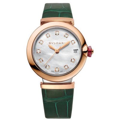 首頁 > 箱包配飾 > 寶格麗 > 【包稅】預定2-3周BVLGARI/寶格麗18K金玫瑰金和精鋼錶殼白色珍珠母貝錶盤鑲有鑲有鑽石的時標日期窗和綠色鱷魚皮錶帶LVCEA自動機械手錶33毫米102640