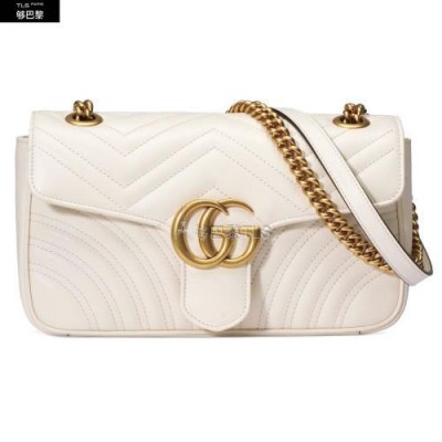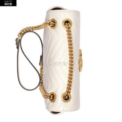 小号GGMarmont链条肩背包采用颇具结构化的柔软造型,超大号翻盖扣配以双G金属配件。滑动链条包带有多种背法,可在肩背和手提之间自由转换。采用绗缝波人形花纹皮革,背面配以心形图案。