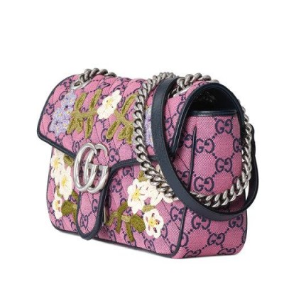 【包税】GUCCI/古驰 2021春夏新款 GG Marmont‎系列 小号女士粉色和蓝色GG帆布花卉贴花银色饰面双G扣斜挎单肩手提包‎4434972UZNN5286