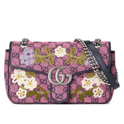 【包稅】GUCCI/古馳2021春夏新款GG Marmont‎系列小號女士粉色和藍色GG帆布花卉貼花銀色飾面雙G扣斜挎單肩手提包‎4434972UZNN5286