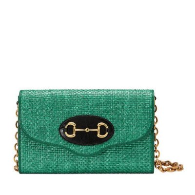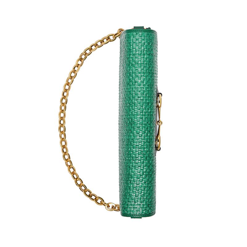 Maison钟爱的系列之一Gucci Horsebit 1955系列的宇宙充满了百搭混合轮廓。单肩包饰有可拆卸链带,眨眼间就变成了手拿包。配件的金色Horsebit细节与翠绿色的稻草效果织物相结合。