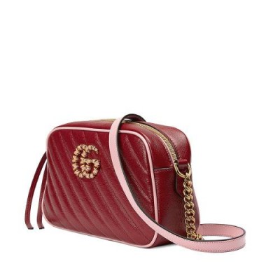【包稅】GUCCI/古馳2021春夏新款GG Marmont系列女士小號深紅色和淡粉色皮革拉鍊珐琅雙G單肩斜挎手提包4476321X5EG6476