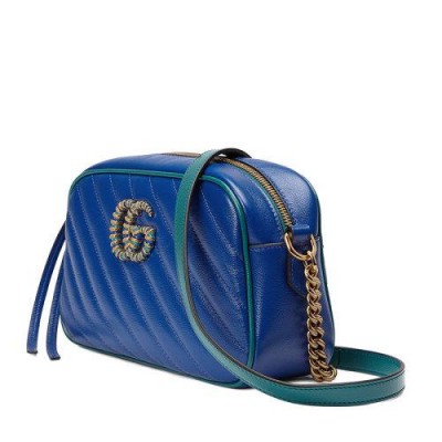• 【包税】GUCCI/古驰 2021春夏新款 GG Marmont系列 女士小号蓝色和翠绿色皮革拉链珐琅双G单肩斜挎手提包4476321X5EG8382