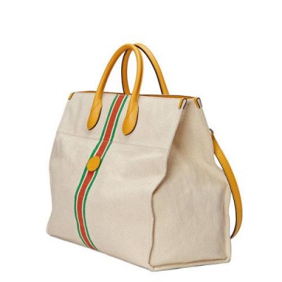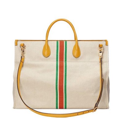 【包税】GUCCI/古驰 21春夏新款pliable系列 大号米色亚麻帆布红绿条纹细节黄色皮革手柄单肩手提包‎‎6588762U2AG8684