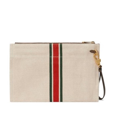 这款手拿包采用米色亚麻制成,并配有存档细节。为了向众议院创始人致敬,绿色和红色织带结合了带有Guccio Gucci会标的皮革标签,以突出徽标的存在。
