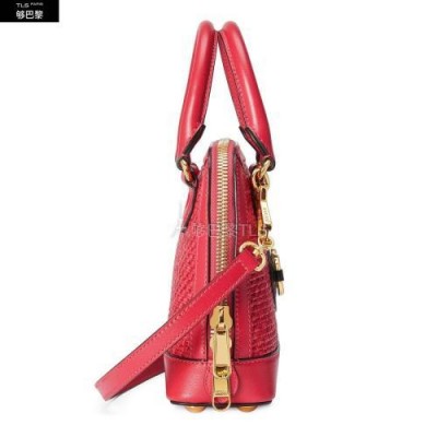 Gucci马衔扣1955系列运用纹理草编效果织物融合鲜艳明快的色调,重塑了对现代优雅的解读。这款迷你手提包采用柔和的珊瑚红色草编效果织物材质制作而成。
