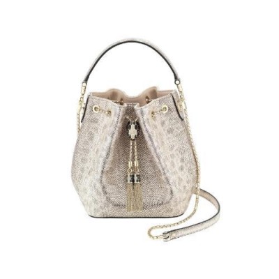La famille Serpenti Forever accueille un nouveau membre : le sac seau tendance. Ce modele en karung raffine effet metallise couleur Milky Opal illustre la capacite des artisans Bvlgari a transformer des materiaux precieux en des pieces intemporelles. Les cordons fonctionnels de ce sac sont reinterpretes dans le style Bvlgari : ils prennent la forme de chaine a motif en ecailles, completes par le fermoir emblematique Serpenti en email noir et couleur Milky Opal scintillant avec yeux en onyx au cha*W*rme irresistible. L’anse amovible et la chaine en forme de serpent en laiton dore assurent un look confortable et polyvalent. Petit modele dote d’un compartiment a soufflet et d’une plaque en metal ornee du logo Bvlgari a l’interieur. Dimensions : 16 x 19 x 10 cm.