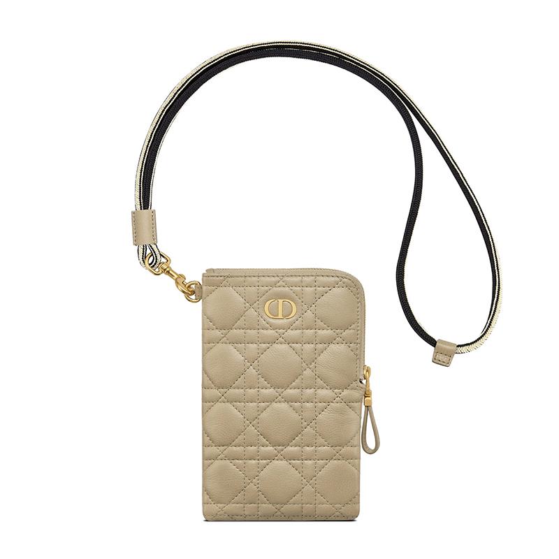 Dior Caro多功能离合器是柔软的绳色小牛皮的混合产品,并通过标志性的Cannage针脚进行了改进。它由两个可分离的拉链元素组成。小口袋可存放钥匙或找零,而更宽敞的口袋可存放电话。可拆卸的抽绳可将其斜挎在脖子上,也可将其单独放入袋中。
