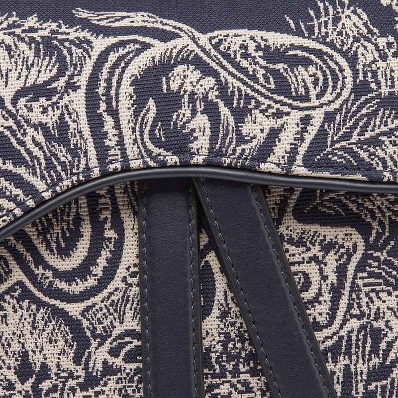 标志性的马鞍包由Maria Grazia Chiuri带来。它采用提花帆布制成,采用蓝色Toile de Jouy Reverse,通过倒置配色方案呈现品牌的标志性图案。它具有传奇色彩的设计包括带有磁性D形环扣的Saddle翻盖,以及在过时的金色金属手柄两侧的CD签名。该马鞍包既可以手提也可以背在肩上,并可以使用不同的肩带进行个性化设置。