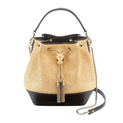 Serpenti Forever小号水桶包,米色酒椰纤维和黑色小牛皮,黑色纳帕皮衬里。迷人的Serpenti金色黄铜表扣,搭配天然哑光珐琅,纯天然米色和with玛瑙双眼。