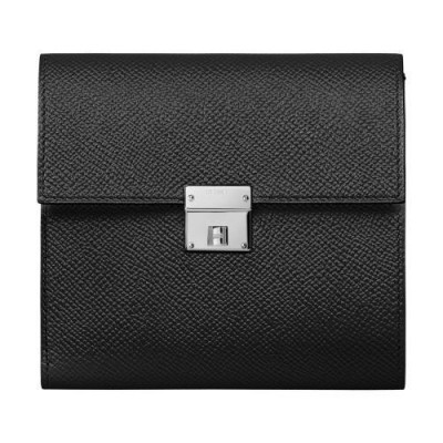 Portefeuille en veau Epsom, bijouterie argentee palladieea l’interieur : un porte-monnaie avec fermeture a glissiere, cinq poches cartes de credit, une poche carte d’identite, une poche financiereUne ligne aux formats carres qui met en valeur le fermoir inspire des serrures des annees 1960 et de la gravure H raye du cadenas de nos sacs.