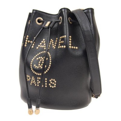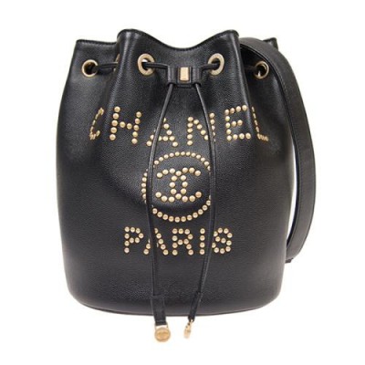 【包稅】Chanel/香奈兒20春夏女士黑色牛皮金扣經典logo裝潢單肩包斜挎包水桶包