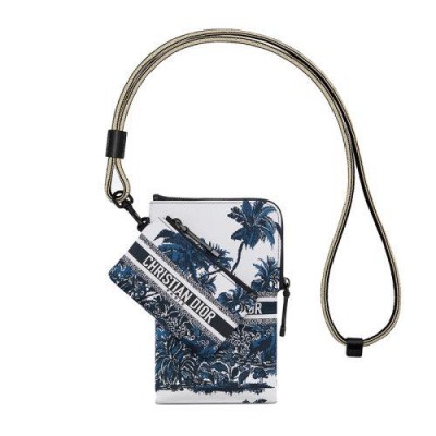 DiorTravel多功能离合器是蓝色技术面料的混合创作,展示了Dior Palms主题,重新诠释了标志性的Toile de Jouy。它由两个可分离的拉链元素组成。小口袋可存放钥匙或找零,而更宽敞的口袋可存放电话。可拆卸的抽绳可将其斜挎在脖子上,也可将其单独放入袋中。