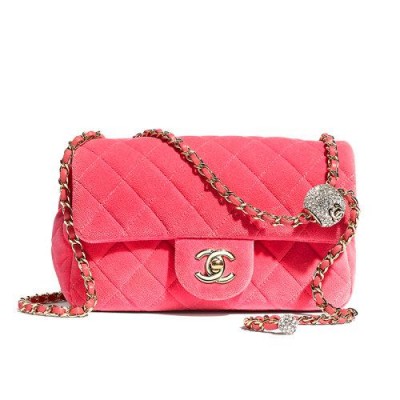 【包郵包稅】CHANEL/香奈兒2020秋季爆款新款粉色絲絨可調節金鏈點綴水晶球雙C斜挎單肩包