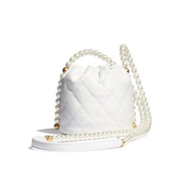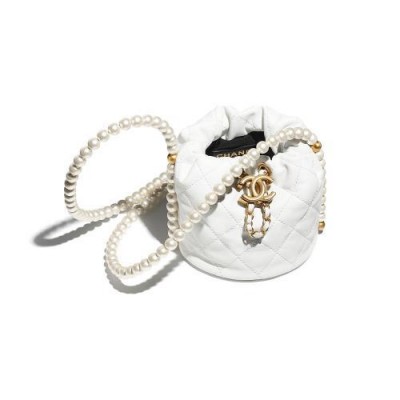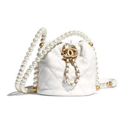 【預售】CHANEL/香奈兒白色小牛皮珍珠跟金色合金MINI帶抽繩水桶包單肩包AS2529 B05543 10601