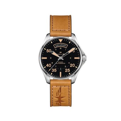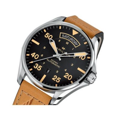 Hamilton/漢密爾頓瑞士手錶卡其航空飛行員系列星際穿越同款自動機械男錶42mm黑盤淺棕色皮帶H64645531