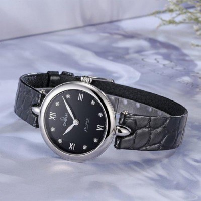 OMEGA/歐米茄瑞士手錶碟飛系列鑲鑽女士石英腕表皮帶黑盤424.13.27.60.51.001