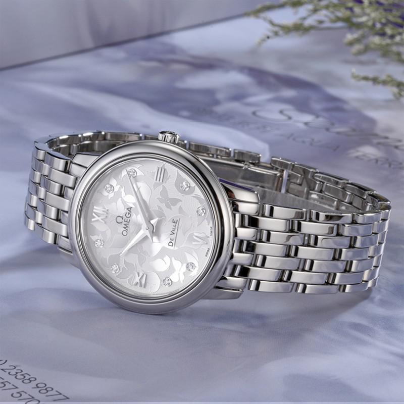 OMEGA/欧米茄瑞士手表 碟飞系列镶钻蝴蝶图案石英机芯女士腕表 钢带银盘424.10.27.60.52.001