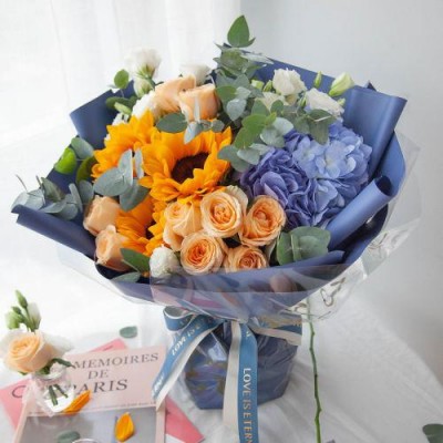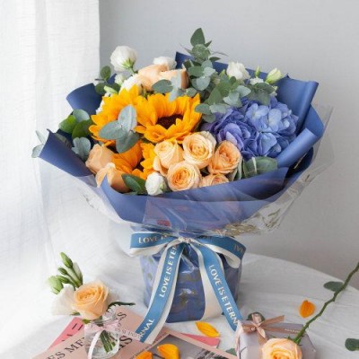 首頁 > 鮮花綠植 > 花禮 > 花禮/星河璀璨/香檳玫瑰9枝、藍繡球、向日葵、白色洋桔梗、大葉尤加利/七夕情人節禮物鮮花/當日達