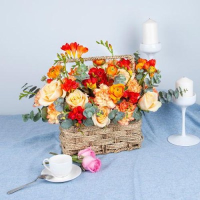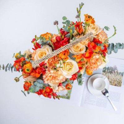 花礼/十全十美/花篮香槟玫瑰、橙康乃馨洋牡丹/七夕情人节礼物鲜花/当日达