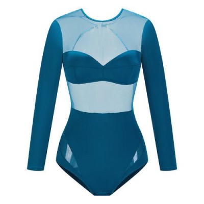 【21春夏】太平洋蓝绿色/黑色弹力布网纱拼接长袖大U型露背连体衣