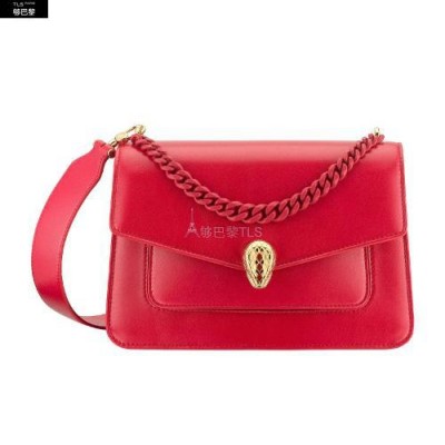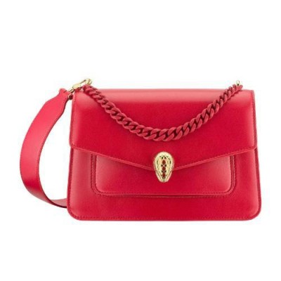 La famille Serpenti Forever accueille un nouveau sac a bandouliere qui affiche une silhouette resolument contemporaine a l’es*W*prit urbain. Confectionne en cuir nappa doux couleur rouge Amaranth Garnet, ce sac a chaine maxi arbore des details en laiton dore. Ce modele est orne d'une nouvelle interpretat*w*ion du fermoir Serpenti en laiton dore, inspire par une ancienne montre Bvlgari des annees 60, avec petites ecailles en cornaline rouge au centre et yeux en email rouge. Clin d’oeil a l’ame du joaillier, une chaine Bvlgari emblematique orne le rabat a l’image d’un collier, qui peut egalement se convertir en une poignee raffinee. Moyen modele avec un compartiment et une bandouliere en cuir detachable et reglable. Une poche ouverte, une poche zippee de separation et un miroir personnalisable completent ce modele a l'interieur. Une poche avant et une poche arriere plaquee parachevent le sac a l'exterieur.