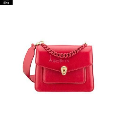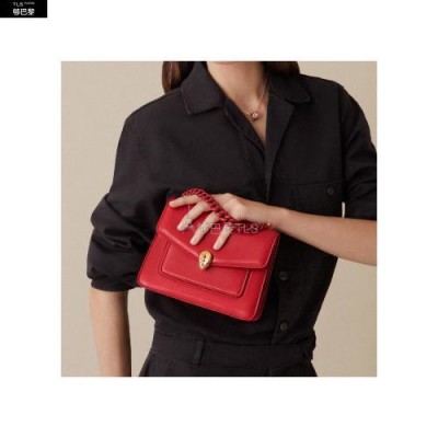 La famille Serpenti Forever accueille un nouveau sac a bandouliere qui affiche une silhouette resolument contemporaine a l’es*W*prit urbain. Confectionne en cuir nappa doux couleur rouge Amaranth Garnet, ce sac a chaine maxi arbore des details en laiton dore. Ce modele est orne d'une nouvelle interpretat*w*ion du fermoir Serpenti en laiton dore, inspire par une ancienne montre Bvlgari des annees 60, avec petites ecailles en cornaline rouge au centre et yeux en email rouge. Clin d’oeil a l’ame du joaillier, une chaine Bvlgari emblematique ton sur ton orne le rabat a l’image d’un collier, qui peut egalement se convertir en une poignee raffinee. Petit modele avec un compartiment et une bandouliere en cuir detachable et reglable. Une poche interieure a miroir, une poche avant, une poche arriere plaquee et un miroir personnalisable completent ce modele. Dimensions : 20 x 14 x 8,5 cm.