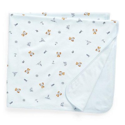 这款毛毯选用柔软的棉质双面布制成,一面饰有 Polo 小熊和海军风格图案,另一面为纯色