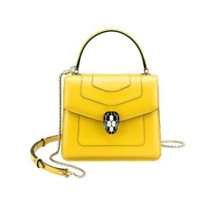 Le sac a bandouliere Serpenti Forever revet de nouvelles couleurs pour la saison. Ce modele en cuir de veau couleur Daisy Topaz est rehausse de details en laiton dore. Le fermoir emblematique Serpenti en email noir et couleur blanc agate hypnotise avec ses yeux en malachite au cha*W*rme envoutant. Sac a main dote de trois compartiments a soufflet et d’une chaine en forme de serpent ajustable et amovible avec bandouliere en cuir pour un look polyvalent. Petit modele dote d’un miroir de poche et d’une plaque en cuir ornee du logo Bvlgari. Dimensions : 18 x 15 x 9,5 cm.