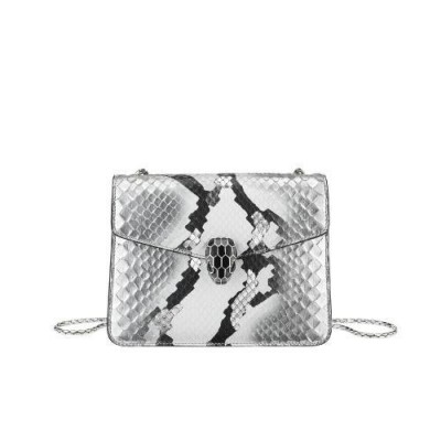 Le sac a bandouliere Serpenti Forever revet de nouvelles couleurs pour la saison. Ce modele en python raffine « Ice Glam » blanc, argente et noir illustre la capacite des artisans Bvlgari a transformer des materiaux precieux en des pieces intemporelles. Le fermoir emblematique Serpenti en email noir hypnotise avec ses yeux en onyx au cha*W*rme envoutant. Une chaine en laiton, inspiree par l’allure sinueuse du serpent, et un petit miroir de poche completent l’ensemble. Petit modele dote d’un compartiment a soufflet. Dimensions : 20 x 14 x 4,5 cm.