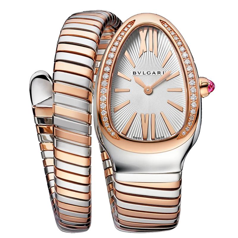 首頁 > 箱包配飾 > 寶格麗 > 【包稅】預定2-3周BVLGARI/寶格麗鑲有明亮切割鑽石的18K金玫瑰金表圈和不銹鋼單螺旋手鏈銀色不透明錶盤SERPENTI TUBOGAS石英手錶35毫米102237