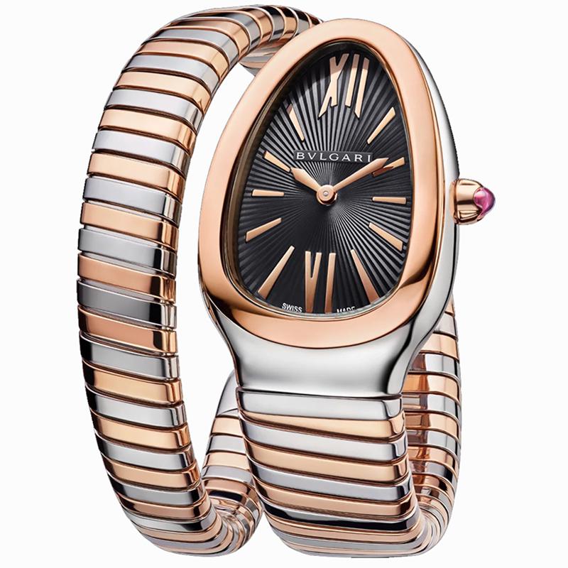 【包稅】預定2-3周BVLGARI/寶格麗一個螺旋形錶殼和18K金玫瑰金和精鋼錶鏈黑色不透明錶盤SERPENTI TUBOGAS石英手錶35毫米102123