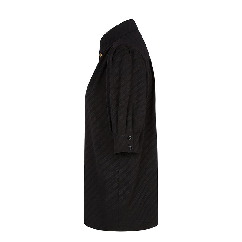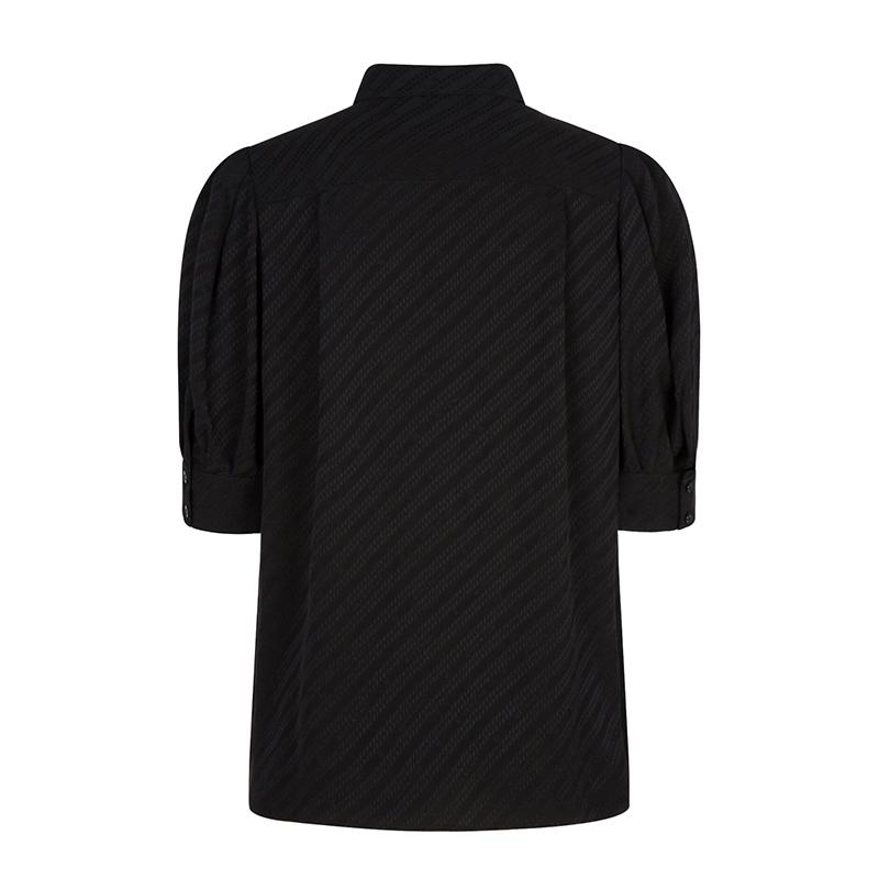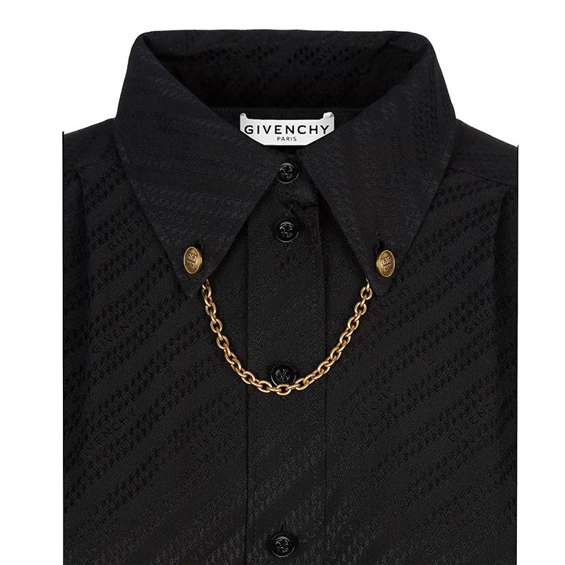 黑色真丝提花衬衫搭配GIVENCHY Chaîne图案,短泡泡袖设计,衣领饰有可拆卸小链条,配以2粒复古金色金属4G LOGO纽扣,正面饰以褶裥。
