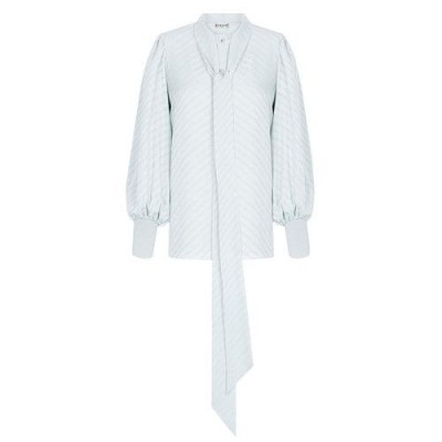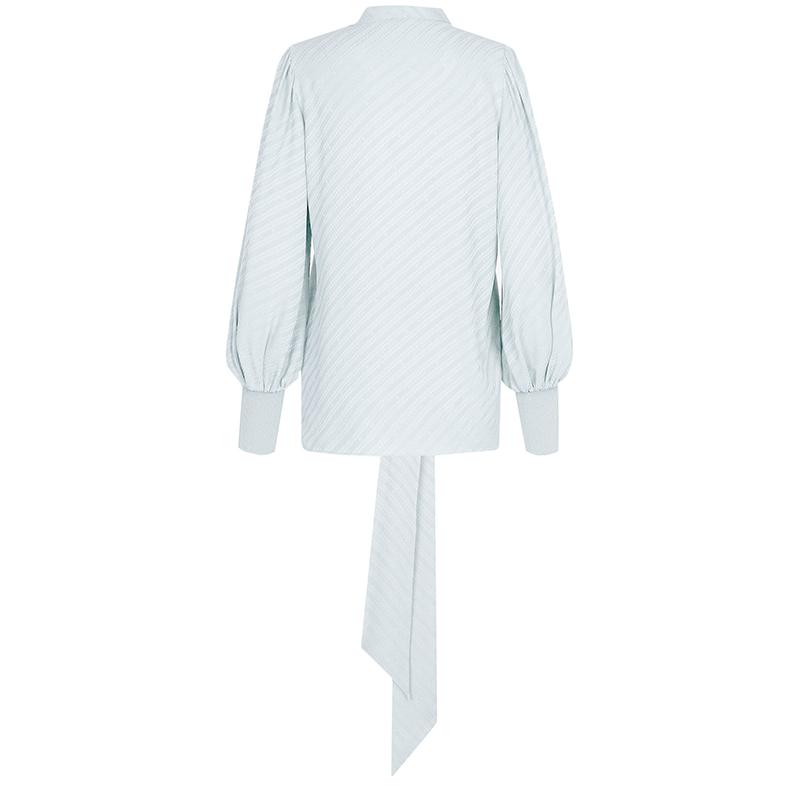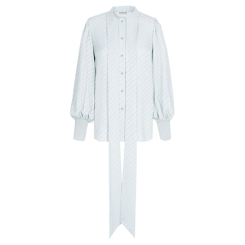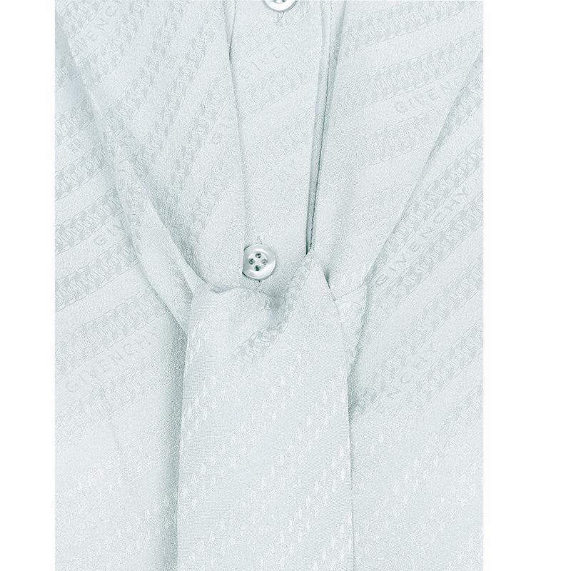 冰蓝色桑蚕丝为主的提花衬衫,饰有GIVENCHY Chaîne图案,长泡泡袖,同系配色罗纹针织袖口。