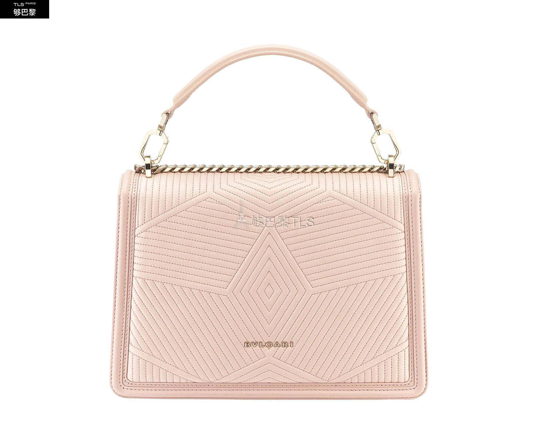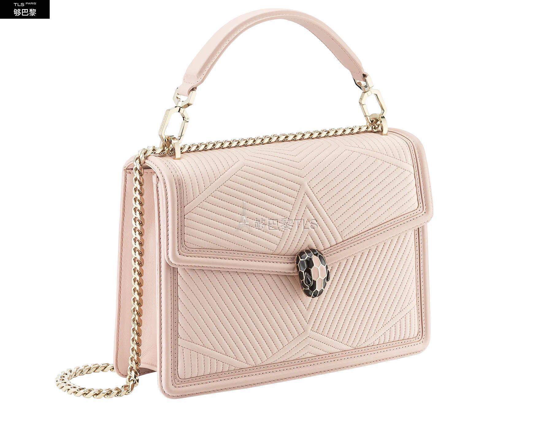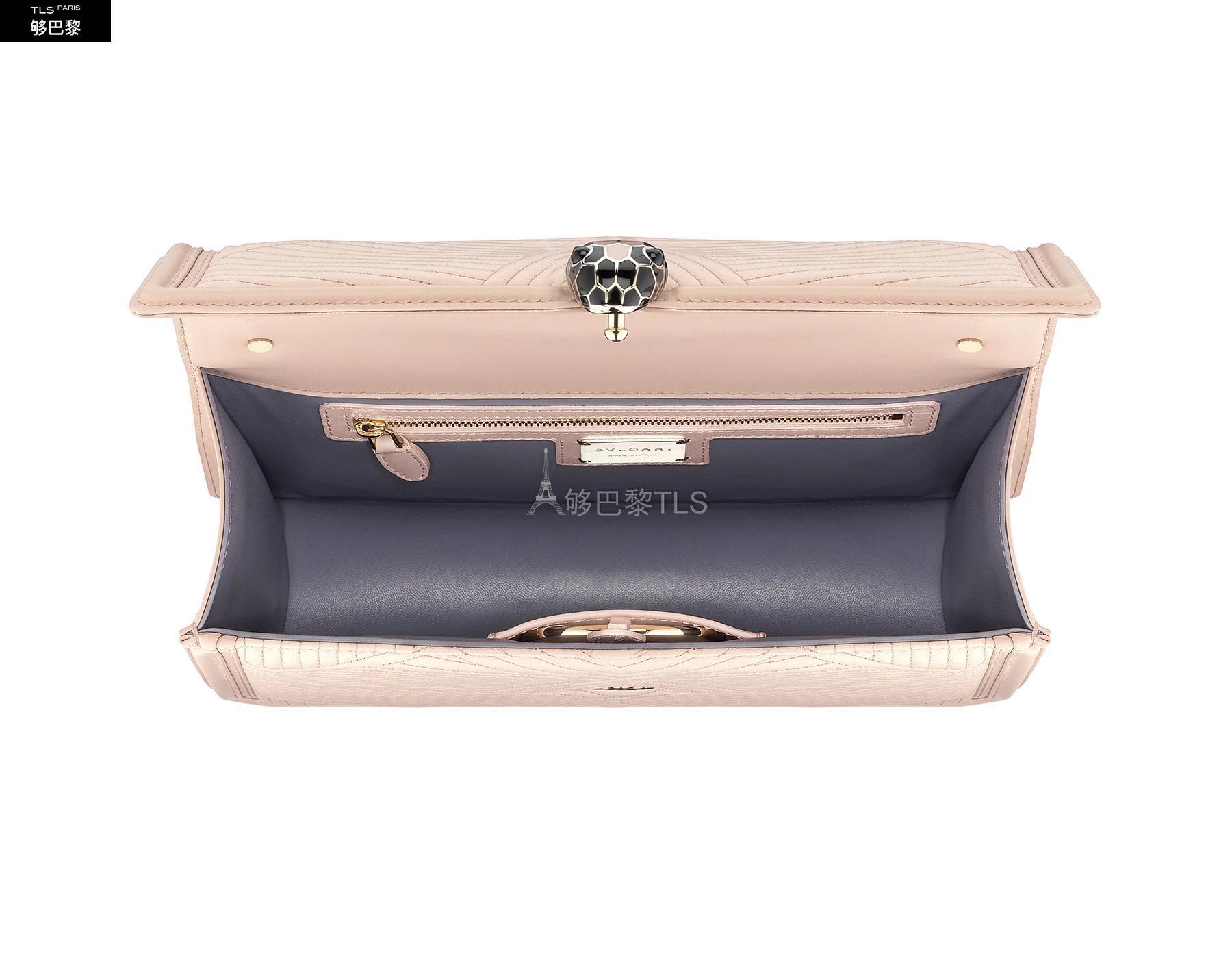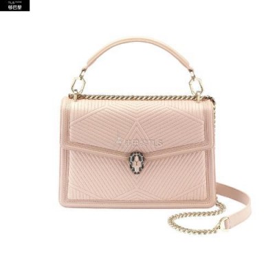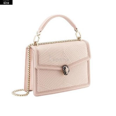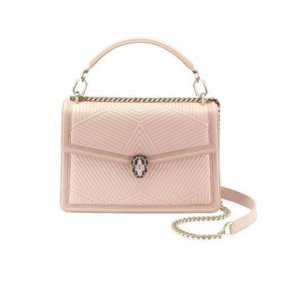 Revisite dans une nouvelle couleur tendance, le sac a bandouliere Serpenti Diamond Blast presente des lignes nettes creant un contraste original avec un motif exclusif legerement *w*matelasse. Le corps du sac en cuir nappa couleur Crystal Rose s'agremente d'un motif *w*matelasse en trois dimensions, inspire des nombreuses facettes d'un diamant brillant. Son profil externe est rehausse d'un pourtour geometrique en cuir de veau ton sur ton. Fermoir emblematique Serpenti en laiton dore et email noir et couleur Crystal Rose avec yeux en onyx elegants. Accessoire ideal d'un look de jour sophistique, le sac se pare d'une chaine epaisse, d'une bandouliere en cuir ajustable et d'une anse amovible pour plus de polyvalence. Moyen modele dote d'un compartiment a soufflet et de plusieurs poches a l’interieur. Plaque en metal ornee du logo Bvlgari a l’interieur et miroir de