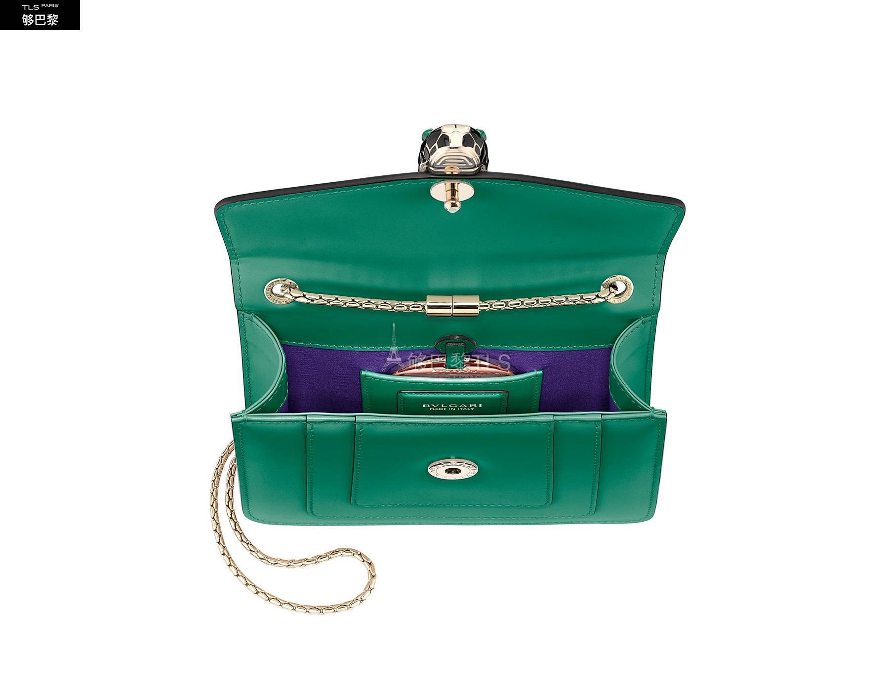 Sac a bandouliere Serpenti Forever en cuir de veau vert emeraude avec fermoir Serpenti en laiton plaque or et email noir et blanc avec yeux malachite. Petite taille a un soufflet, miroir de poche et precieuse chaine en forme de serpent. Disponible dans d'autres coloris. Dimensions : 20 x 15 x 3,5 cm.