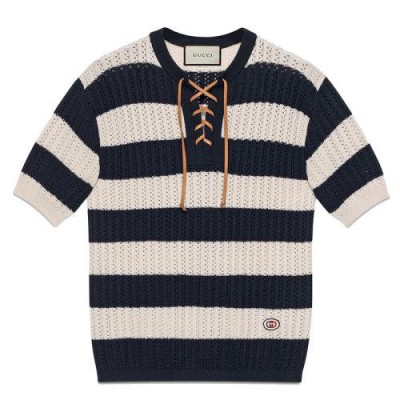 【包稅】GUCCI/古馳21年早春新款男士深藍色和灰白色條紋羊毛混紡系帶polo衫642777XKBQM4650