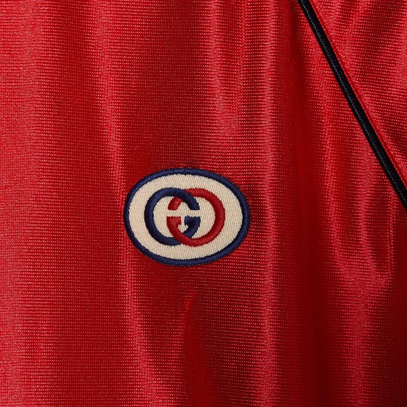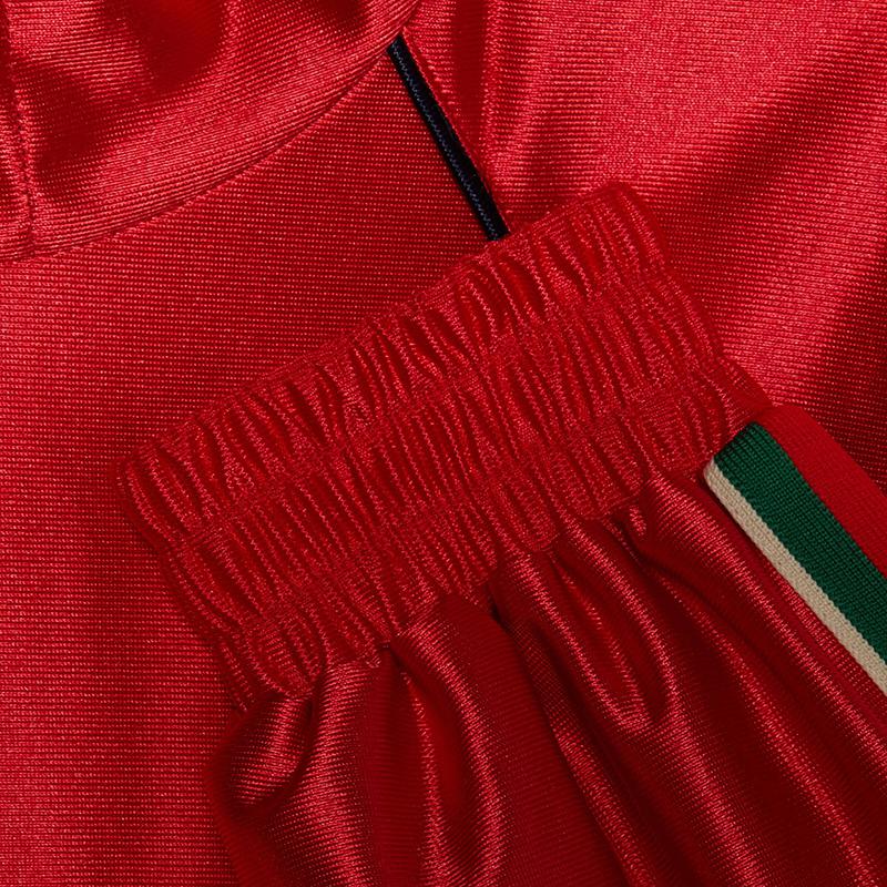 在整个Opening系列中,邀请了违反规范的闪亮面料。这款运动服式连帽运动衫采用柔软闪亮的技术涤纶平纹针织面料制成。令人着迷的亮红色织物具有帆布效果,展示了标志性的细节,例如马术风格的网状条纹和古驰(Gucci)徽标。