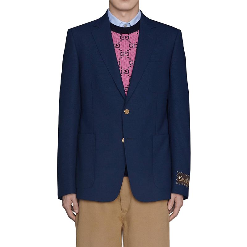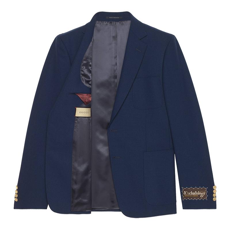 房子的新元素编织在衣服上,以当代的方式表达出复古的灵感。这款深蓝色的羊毛纱布西服外套上绣有Gucci Eschatology标签,凸显了探索人与宇宙最终命运的学说。