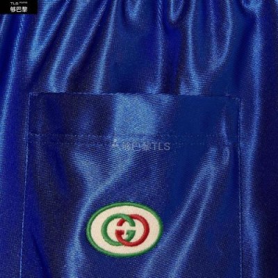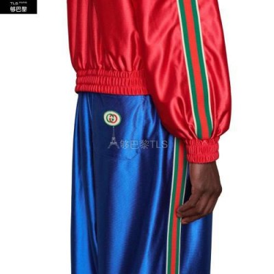 闪亮面料突破传统规则束缚,在无边序曲系列中探索全新用途和设计。这款运动装风格的慢跑长裤由质感柔软的闪亮平纹针织聚酯纤维面料制作而成。蓝色面料宛若画布般点缀丰富装饰细节,包括马术风格织带和Gucci复古标识,打造令人惊艳的设计。