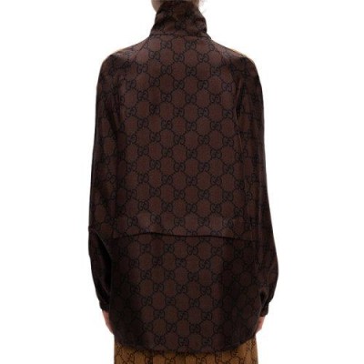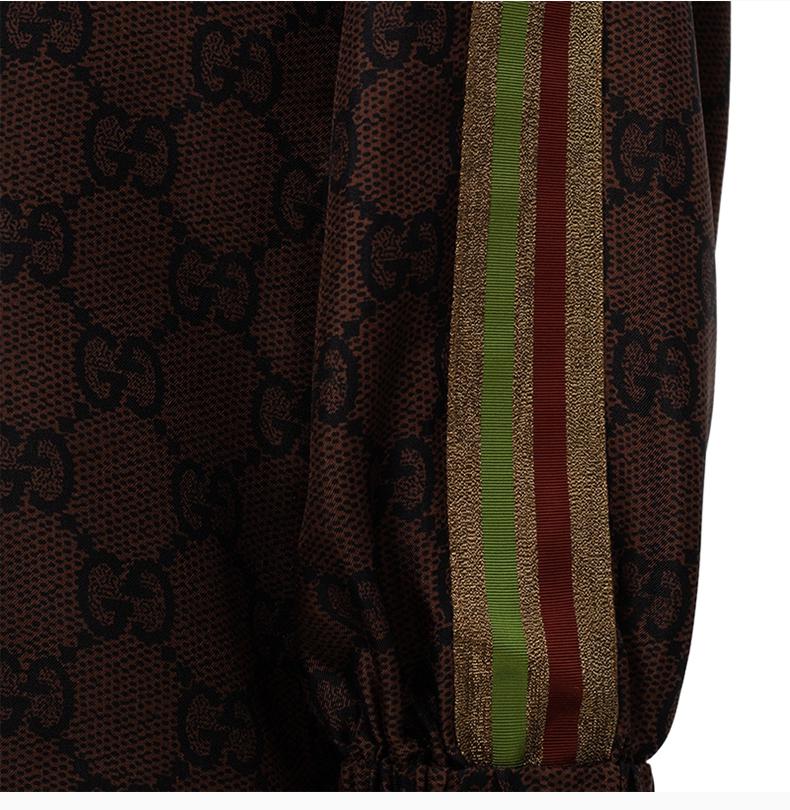 GUCCI古馳男士服裝21春夏棕色老花格紋立領拉鍊絲質外套夾克男士夾克