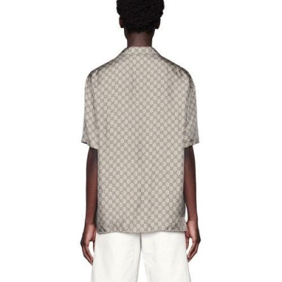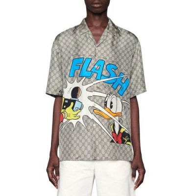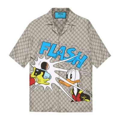 GUCCI古馳男士服裝21春夏米色翻領格紋唐老鴨圖案短袖襯衫男士短袖襯衫